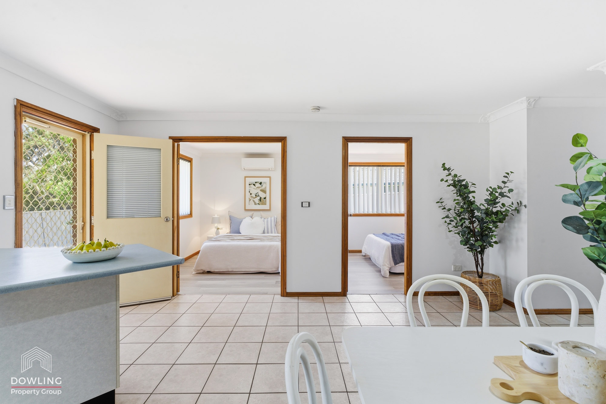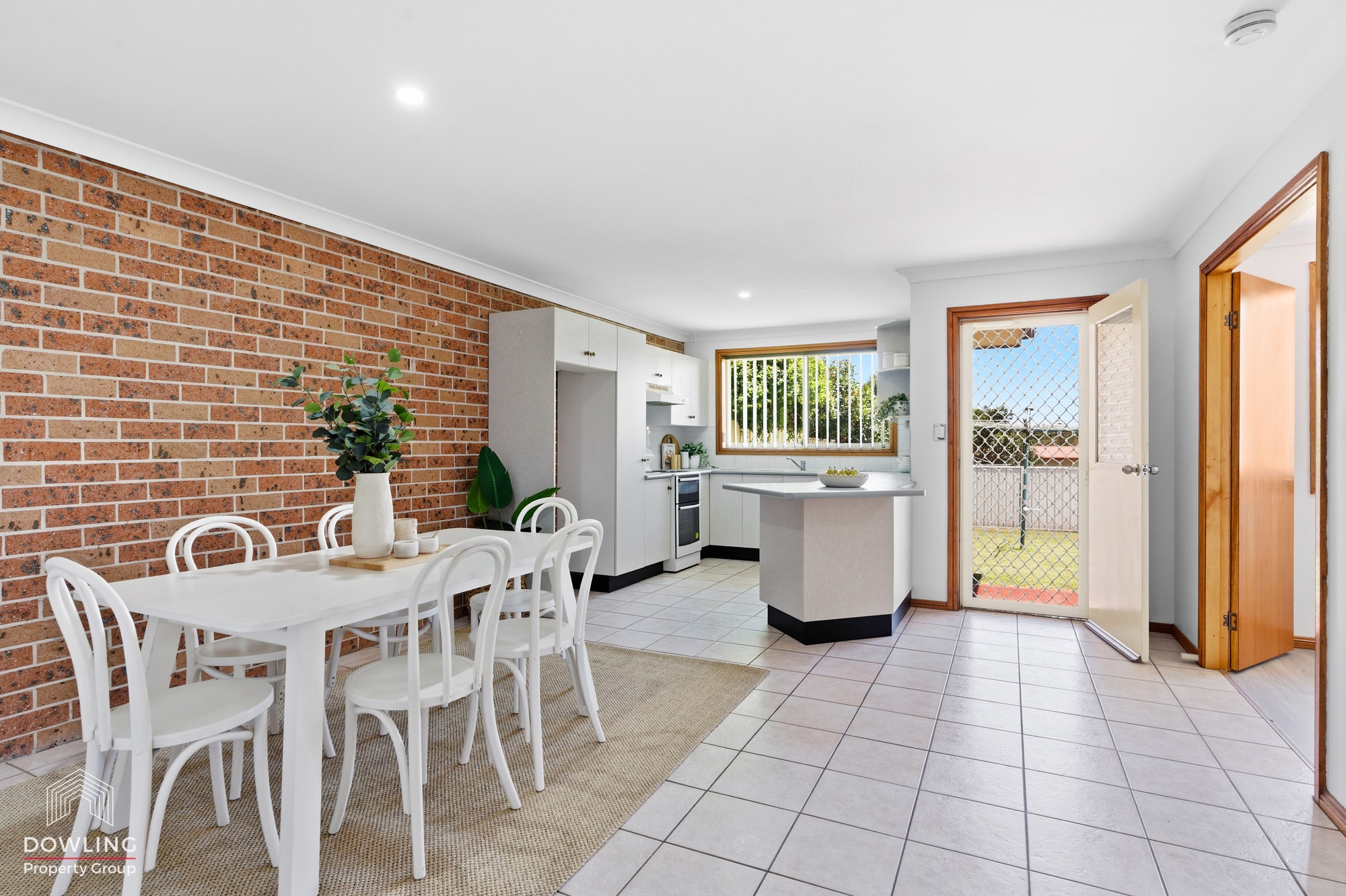 The centrally located two-way bathroom includes a full-sized bath with shower recess and a separate toilet. An open-plan kitchen and dining area seamlessly flows to the outdoor living space, overlooking a private, secure yard — ideal for relaxed entertaining or low-maintenance living.