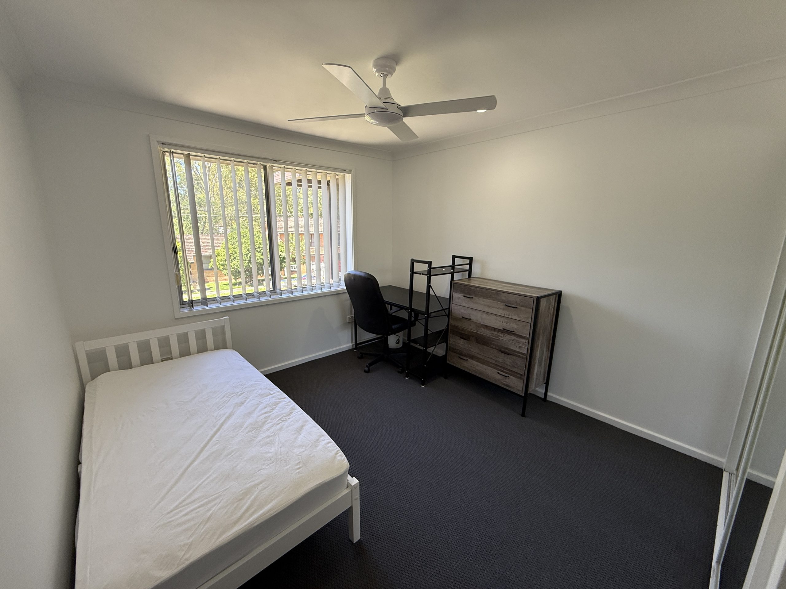 Located within walking distance to the Newcastle University is this fully furnished and renovated bedroom in a share house with a single bed, built-in mirrored wardrobe, deck and chair.